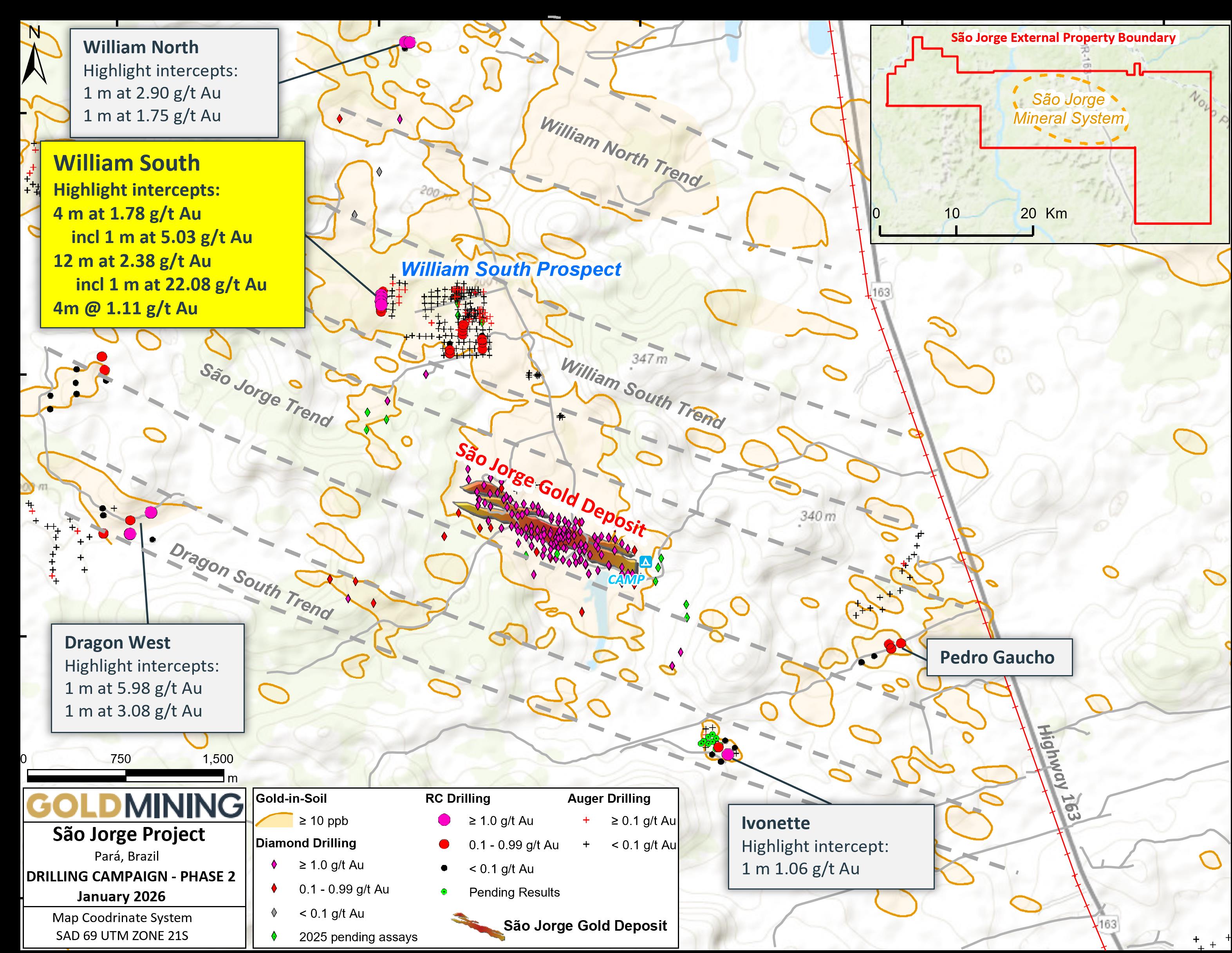 Vancouver, British Columbia – January 6, 2026 – GoldMining Inc. (the "Company" or "GoldMining") (TSX: GOLD; NYSE American: GLDG) is pleased to report additional assay results from the 2025 RC drilling program at its 100% owned São Jorge Project ("São Jorge" or the "Project") in the Tapajós gold district ("Tapajós"), Pará State, Brazil. New exploration results further support the initial drilling results that identified exploration discoveries at four new gold prospects, including at the William South prospect located approximately 1.5 kilometre ("km") north of the existing São Jorge deposit (the "Deposit") (see news release October 20, 2025).