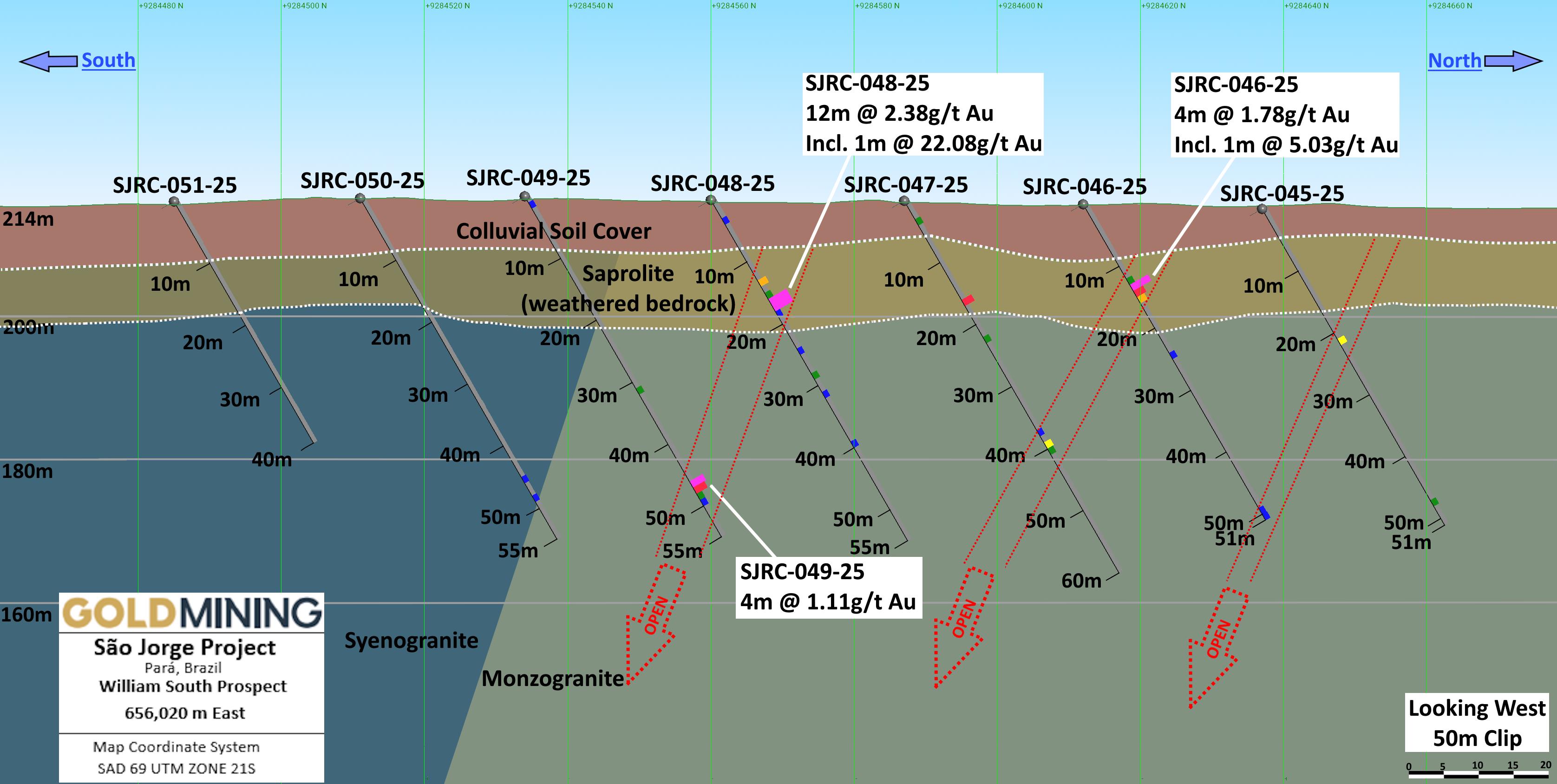 Alastair Still, Chief Executive Officer of GoldMining, commented: "GoldMining is further encouraged by the additional positive drill results yielded from the 2025 RC drilling completed to date at the William South prospect, an emerging gold discovery located a short distance from the known São Jorge gold deposit. The geology and geophysical signature at William South resembles the São Jorge gold deposit itself based on exploration to date. This work has been encouraging of the potential for this area, highlighting that significant additional systematic exploration is required, especially over the core of the IP anomaly which has not yet been tested by drilling.