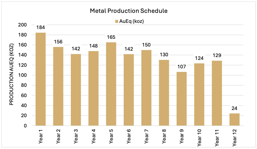 Under the PEA, highest metal production occurs in the initial five years of production averaging 152.4 koz AuEq comprising 126 koz Au, 22.4 Mlbs Cu, and 273 koz Ag annual production. Year 1 production of 176.5 koz AuEq comprises 138 koz Au, 27.0 Mlbs Cu, and 174.8 koz Ag. LOM average production is 137.0 koz AuEq, comprising 107.7 koz Au, 17.0 Mlbs Cu, and 248.6 koz Ag.