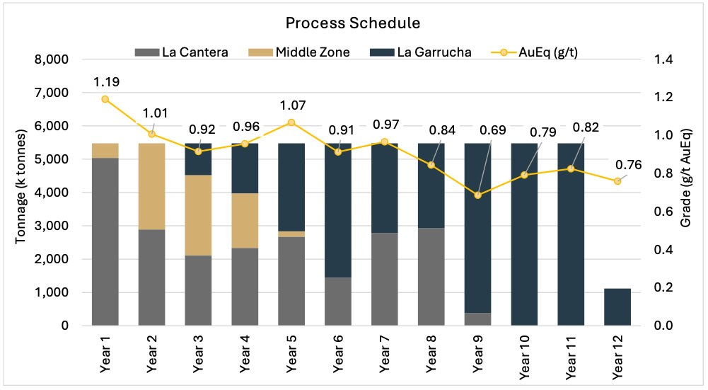 - Strong Production Profile: Average annual production of 152.4 koz Au equivalent ("AuEq") over the first five years of operation, and total life of mine ("LOM") production of 1.5 Moz AuEq (comprising 1.2 Moz Au, 2.6 Moz Ag, and 195 Mlbs Cu) over an 11.2 year projected mine life.